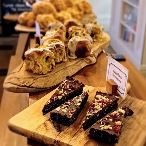 You can sample F.east’s ever-changing selection of fresh, homemade cakes, all made in-house by chef Claire Wellman and her team. Right now, customer favourites include a light and zesty lemon and blueberry cake; an orange and almond cake topped with a tangy orange glaze; a rich chocolate and ginger tiffin and irresistibly delicious individual carrot cakes.