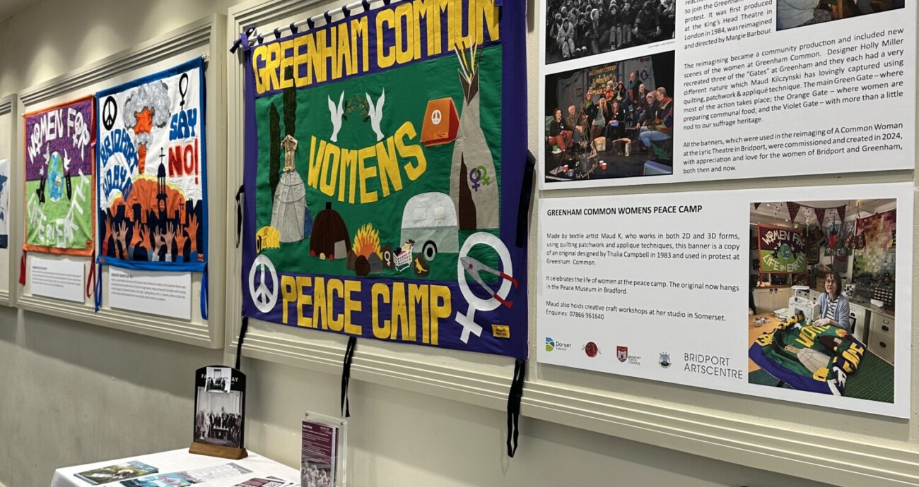 A Common Woman Reimagined, a play about the Greenham Women’s protest, was staged at the Lyric theatre earlier this year. This Exhibition showcases the banners made by artist Maud K displayed.